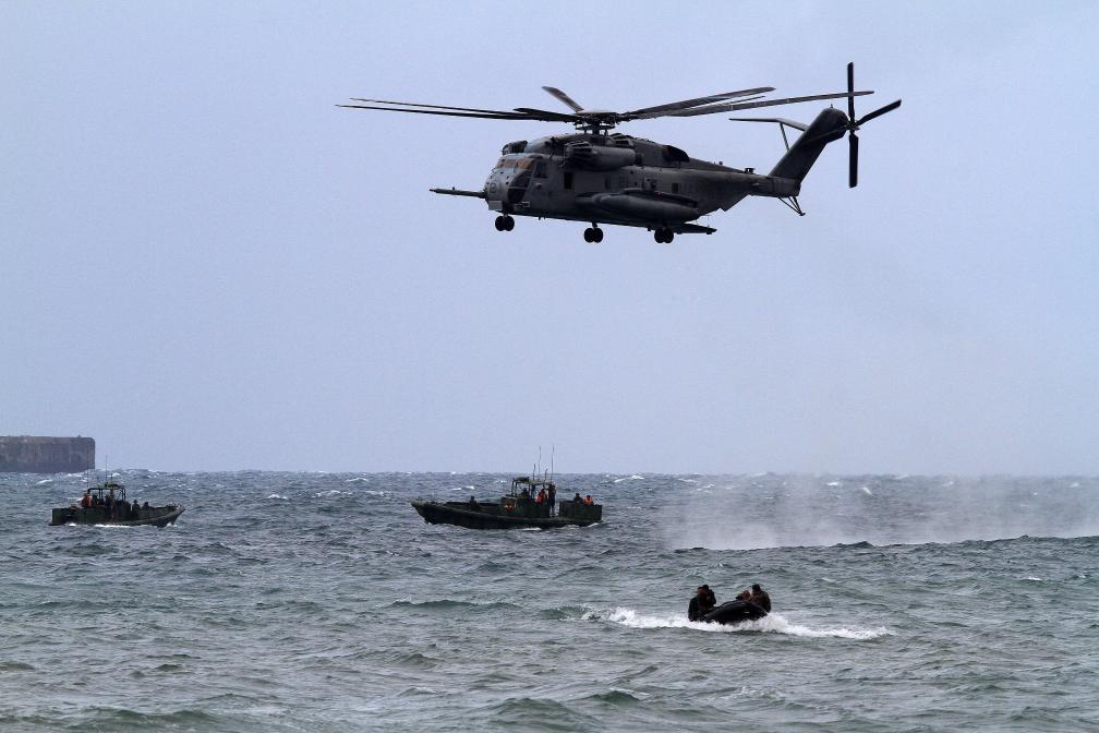 2013年9月20日,在菲律賓甲米地省,一架美軍CH-53E軍用直升機運載美國和菲律賓士兵參加演習。新華社發(烏馬利攝)
