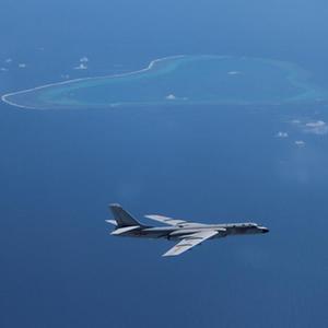 這是轟-6K戰機在黃巖島上空巡航(資料照片)。新華社發
