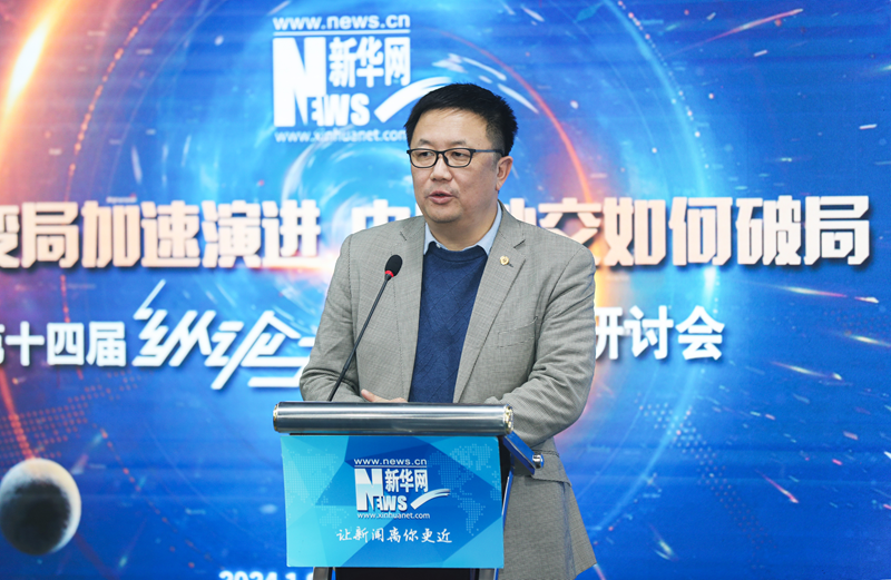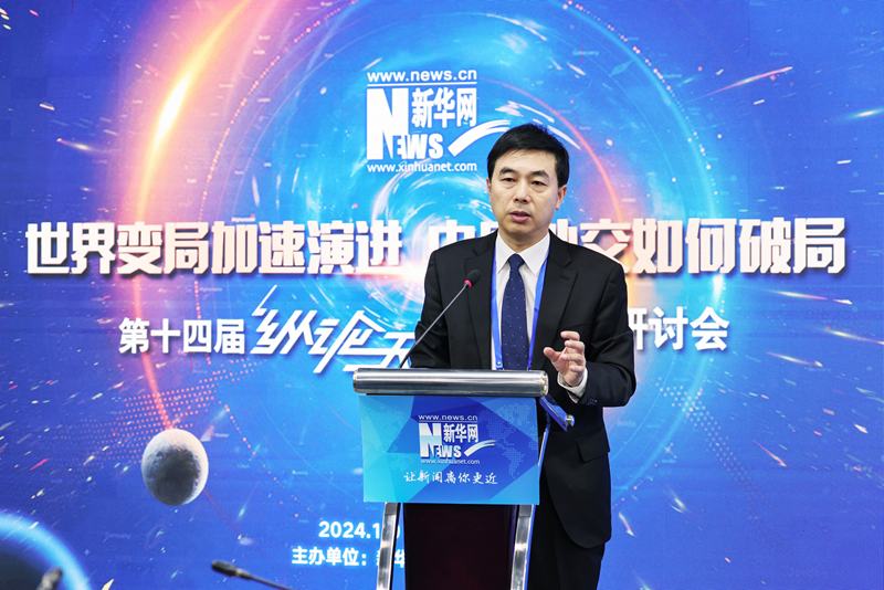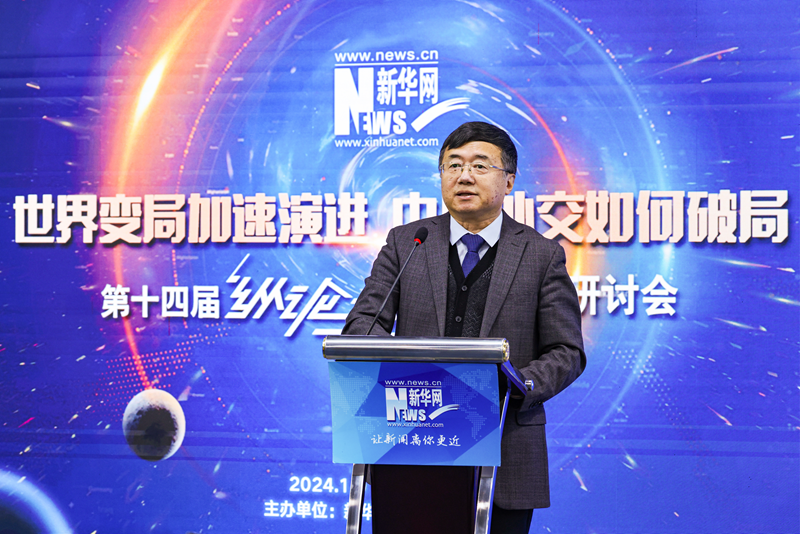 1月9日,新华网第十四届“纵论天下”国际问题研讨会在北京新华网总部举办。图为外交学院院长、中国国际关系学会副会长王帆在进行主题演讲。新华网 杨霁昕 摄