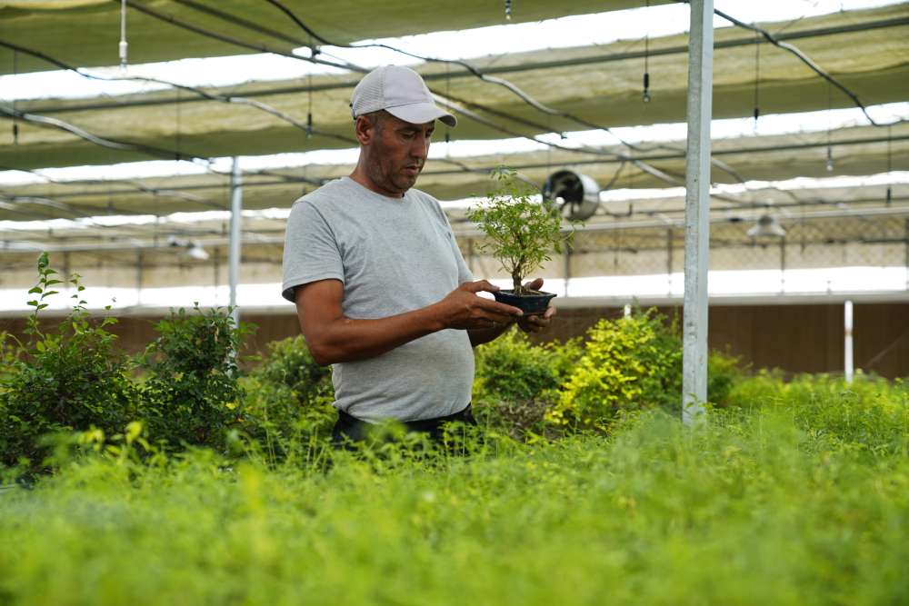 2024年7月28日,在乌兹别克斯坦锡尔河州的上合组织农业基地中乌现代农业科技示范园,工作人员检查盆栽植物。新华社发(扎法尔摄)