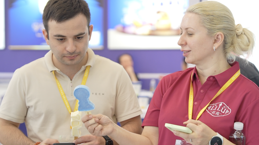 在东北大板品牌展区,蜜瓜、芒果、百香果造型的水果味冰淇淋吸引了众多客商品尝,该系列产品远销新西兰、加拿大、马来西亚、新加坡等国家和地区。