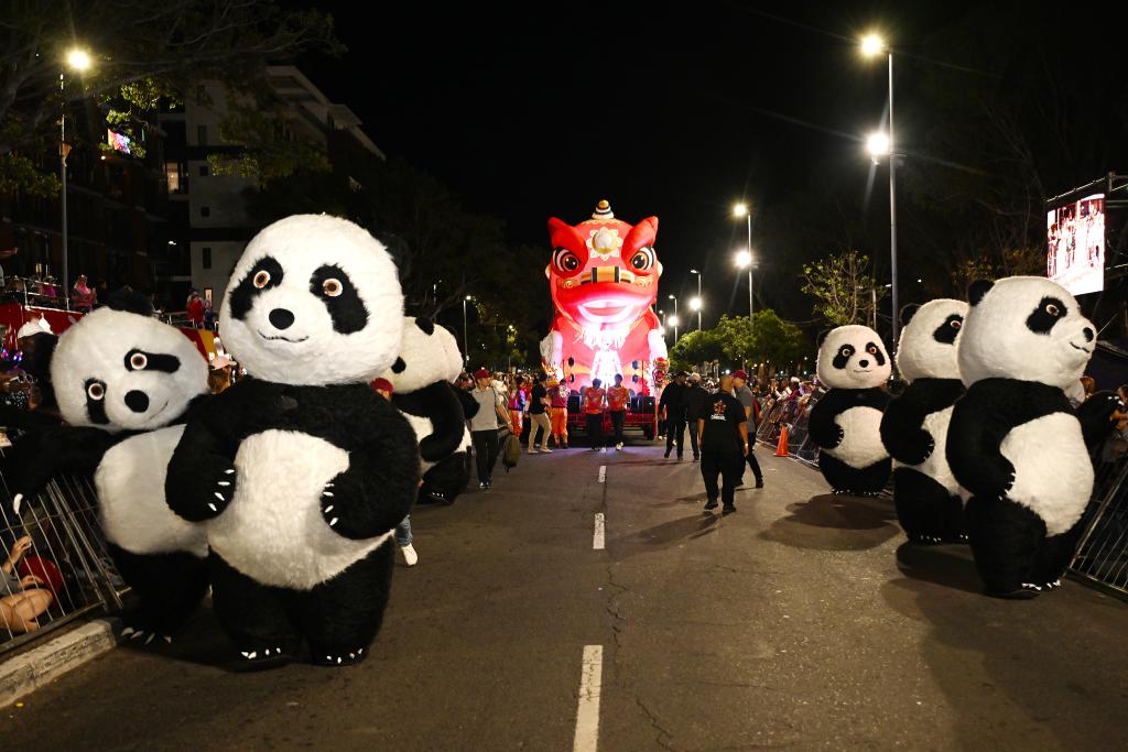 《最炫民族风》的背景音乐中,从黄色长裙到粉色荷花的一秒变装引来阵阵惊叹;两米多高的大熊猫人偶憨态可掬,和道路两旁的观众亲密互动;巨大的红色传统狮形花灯流光溢彩,花车上的人形机器人吸引游客纷纷拍照……在21日晚举行的2026年南非开普敦狂欢节上,中国元素成为整场活动中最为惊艳的一抹色彩。