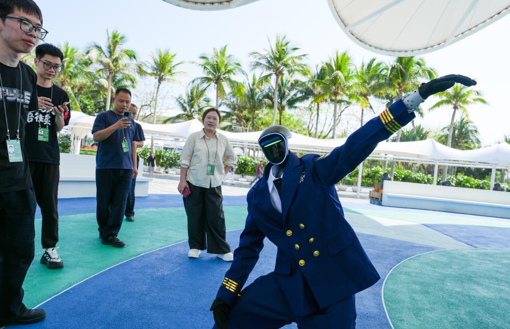 3月24日,人形机器人在海南省琼海市博鳌镇东屿岛跳舞。新华社记者 刘莲芬 摄